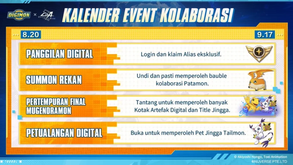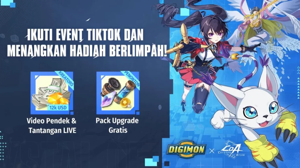 Buat kamu yang suka ngonten, ada challenge bikin video TikTok bertema kolaborasi Digimon x CoA. Tunjukin momen lucu bareng Agumon, digivolution keren, atau epic battle lawan Machinedramon. Total hadiah sampe $7,000, alias sekitar Rp 115 jutaan. Jangan lupa pakai hashtag #DigimonAdventurexCrystalofAtlan ya!